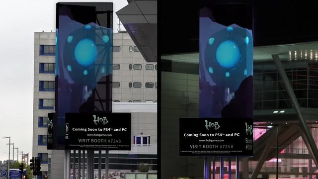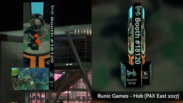 A collection of branded content to promote upcoming games for PAX East 2016 and PAX East 2017 at the Boston Convention & Exhibition Center. Titles include: "Hob" by Runic Games, "Mirage" by Torn Banner, and "Colina Legacy" by Chance6. Runic Games' upcoming title "Hob," Content creation consisted of video editing, trailer creation, and adapting existing concept art/promotional banners to be displayed across the 76' tall outdoor Marquee, and 160' wide indoor Video Wall.